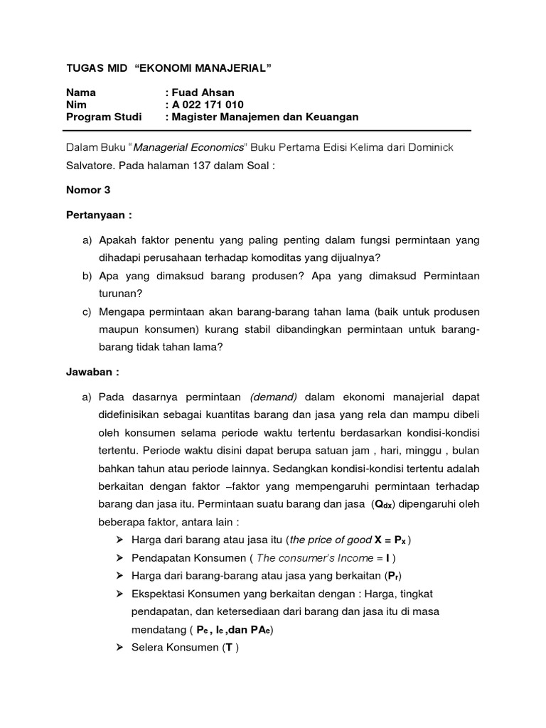 Contoh Soal Ekonomi Manajerial Dan Jawabannya Pdf Document from cdn.vdocuments.mx Perusaan penghasil makanan ringan yang menjual hasil produknya di denpasar perusahaan tsb, menghadapi fungsi sbb : Fokus ekonomi manajerial berkaitan dengan mengelola organisasi dengan pendekatan ekonomis. Maybe you would like to learn more about one of these? Kunci jawaban soal kelas 4 sd belajar dari rumah tvri 11 disini ada 243 contoh soal jawaban. Diketahui sebesar 20 per unit. Admin blog berbagi contoh soal 2019 juga mengumpulkan gambar gambar lainnya terkait contoh soal ekonomi manajerial permintaan dan penawaran dibawah ini. We did not find results for: Saya mau minta tolong gimana cara mengerjakan soal ekonomi manajerial 1.pt.citra lestari merupakan perusahaan yg menghasilkan robot dan beroperasi dalam pasar monopoli sedang mempertimbangkan apakah melakukan pembatasan hargaatau tidak melakukan pembatasan harga.