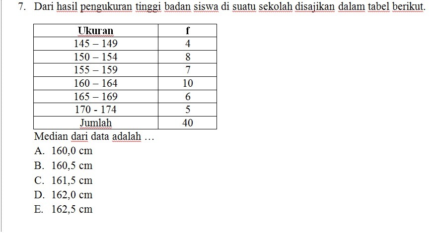 hasil pengukuran tersebut adalah 170, 165, 158, 150, 162, 160, 155, 159 (dalam cm).