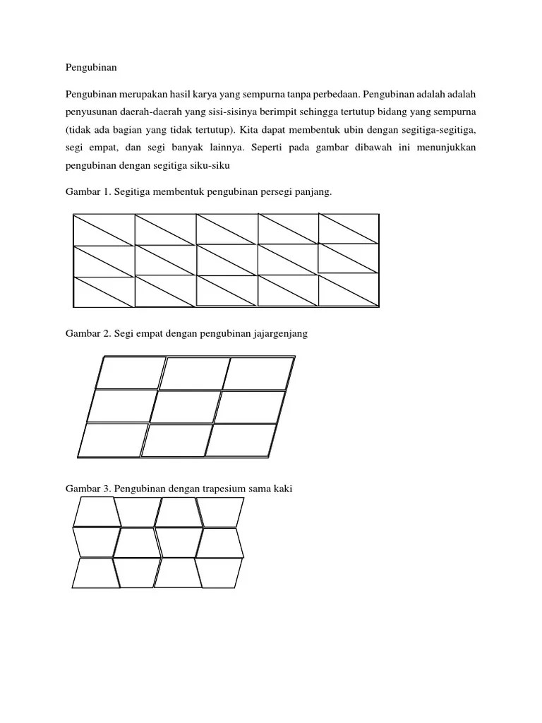 Hitunglah jumlah pola bilangan ke 15 dalam pola bilangan persegi ? Ingat kembali bahwa teselasi atau pengubinan adalah pola yang menutupi bidang datar dengan mentransformasi kumpulan bentuk sehingga tidak ada yang tumpang tindih atau tidak ada ruang kosong. 27 cm dan 210 cm 2. pengubinan menggunakan satu jenis bangun datar, yaitu segi tiga. Kemudian mintalah mereka menuliskan konfigurasinya.