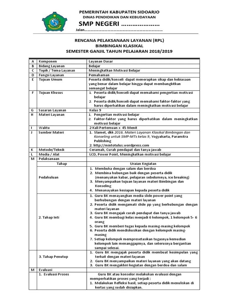 Melakukan refleksi hasil, setiap peserta didik menuliskan . Triyono, mastur, 2014, materi layanan klasikal bimbingan dan konseling bidang belajar, yogyakrata, paramitra. Sampai saat ini siswa belum diperkenankan untuk hadir ke sekolah namun layanan bk harus tetap jalan yakni dengan metode . Berdasarkan hal tersebut maka layanan bimbingan konseling karir juga harus. Belajar, serta aspek lainnya dapat ditambahkan sendiri oleh guru pembimbing dan dikembangkan lagi dalam rencana pelaksanaan layanan 1 silabus dan rpl .